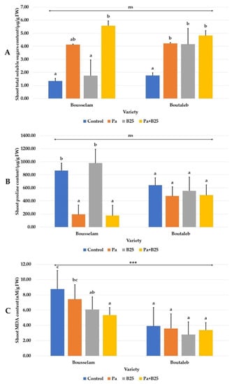 Figure 6. Effect of bacterial inoculation on (A) shoot total soluble sugars content (mg/g FW), (B) shoot proline content (µg/g FW), and (C) shoot malondialdehyde (MDA) content (µM/g FW) of wheat plants grown in sterile compost of Bousselam and Boutaleb varieties. The bar plots represent the mean ± standard error of three different experiments. IBM SPSS Statistics v.24 was used to perform statistical analysis, using a two-way ANOVA and Tukey’s multiple comparison post-test. Significant differences are displayed as: *** p < 0.001. ns: non-significant.