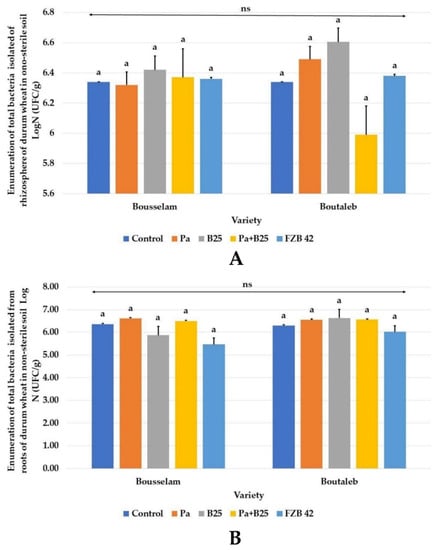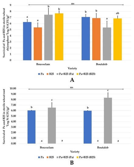 Figure 7. Survival of bacteria, Pa and B25 (Log N(CFU/g)), in (A) rhizosphere and (B) roots of wheat plants of the Bousselam and Boutaleb varieties, grown in sterile compost inoculated with Pa, B25, and Pa + B25. The bar plots represent the mean ± standard error of three different experiments. IBM SPSS Statistics v.24 was used to perform statistical analysis, using a two-way ANOVA and Tukey’s multiple comparison post-test. ns: non-significant.