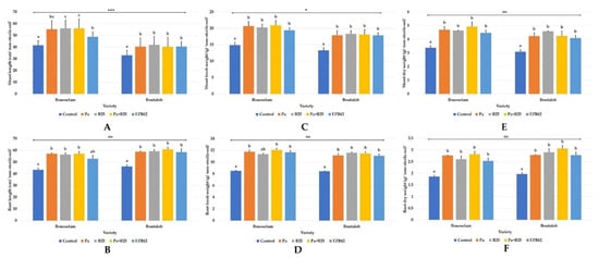Figure 8. Effect of bacterial inoculation on (A,B) shoot and root length (cm), (C,D) shoot and root fresh weight (g), and (E,F) shoot and root dry weight of wheat plants grown on non-sterile soil of Bousselam and Boutaleb varieties. The bar plots represent the mean ± standard error of three different experiments. IBM SPSS Statistics v.24 was used to perform statistical analysis, using a two-way ANOVA and Tukey’s multiple comparison post-test. Significant differences are displayed as: * p < 0.05, *** p < 0.001. ns: non-significant.