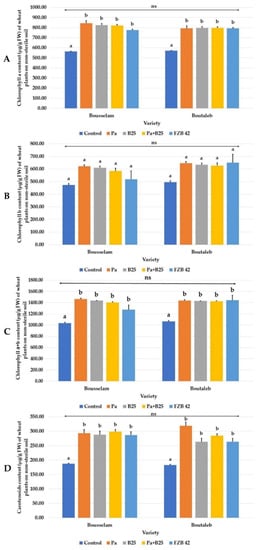 Figure 10. Effect of bacterial inoculation on (A) chlorophyll a (µg/g FW), (B) chlorophyll b (µg/g FW), (C) chlorophyll a + b (µg/g FW), and (D) carotenoid (µg/g FW) contents of wheat plants grown on non-sterile soil of Bousselam and Boutaleb varieties. The bar plots represent the mean ± standard error of three different experiments. IBM SPSS Statistics v.24 was used to perform statistical analysis, using a two-way ANOVA and Tukey’s multiple comparison post-test. ns: non-significant.