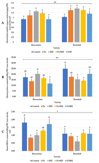 Figure 11. Effect of bacterial inoculation on (A) shoot total soluble sugars content (mg/g FW), (B) shoot proline content (µg/g FW), and (C) shoot malondialdehyde (MDA) content (µM/g FW) of wheat plants grown on non-sterile soil of Bousselam and Boutaleb varieties. The bar plots represent the mean ± standard error of three different experiments. IBM SPSS Statistics v.24 was used to perform statistical analysis, using a two-way ANOVA and Tukey’s multiple comparison post-test. Significant differences are displayed as: * p < 0.05. ns: non-significant.