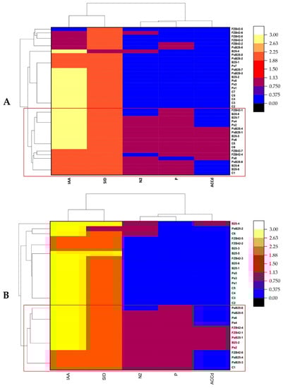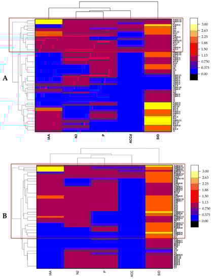 Figure 13. Clusters and heat map of endophytic bacteria from the durum wheat roots inoculated with Pa, B25, FZB42, and Pa + B25 and the expression of their PGP activities (IAA: indole acetic acid production, SID: siderophore production, N2: nitrogen fixation, P: phosphate solubilization, and ACCd: 1-aminocyclopropane-1-carboxylic acid deaminase production). (A) Bousselam variety; (B) Boutaleb variety.