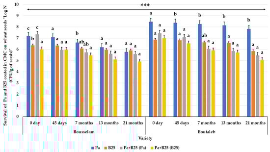 Figure 15. Survival of bacteria, Pa and B25 strains (Log N(CFU/g)), in wheat seeds coated with CMC priming with Pa, B25, and Pa + B25 at different period (0, 45 days and 7, 13, and 21 months) of storage. The bar plots represent the mean ± standard error of three different experiments. IBM SPSS Statistics v.24 was used to perform statistical analysis, using a two-way ANOVA and Tukey’s multiple comparison post-test. Significant differences are displayed as: *** p < 0.001.