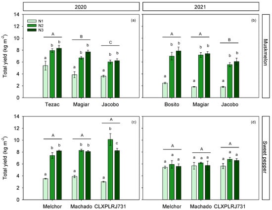 Total yield for three cultivars and three N treatments, for muskmelon (a,b) and sweet pepper (c,d) crops, conducted in 2020 and 2021 years. Different lowercase letters show significant differences between N treatments within each cultivar; different uppercase letters show significant differences between cultivars. Values are means ± SE.