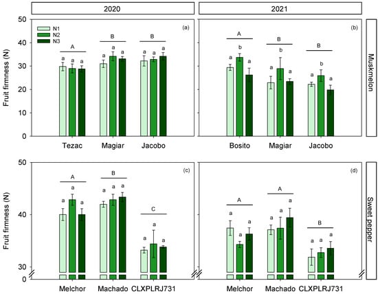 Fruit firmness for three cultivars and three N treatments, for muskmelon (a,b) and sweet pepper (c,d) crops, conducted in 2020 and 2021 years. In muskmelon, the measurements were internal; in sweet pepper, the measurements were external. Different lowercase letters show significant differences between N treatments within each cultivar; different uppercase letters show significant differences between cultivars. Values are means ± SE.