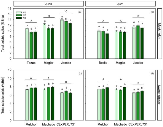 Fruit total soluble solids (TSS), expressed in %Brix, for three cultivars and three N treatments, for muskmelon (a,b) and sweet pepper (c,d) crops, conducted in 2020 and 2021 years. Different lowercase letters show significant differences between N treatments within each cultivar; different uppercase letters show significant differences between cultivars. Values are means ± SE.