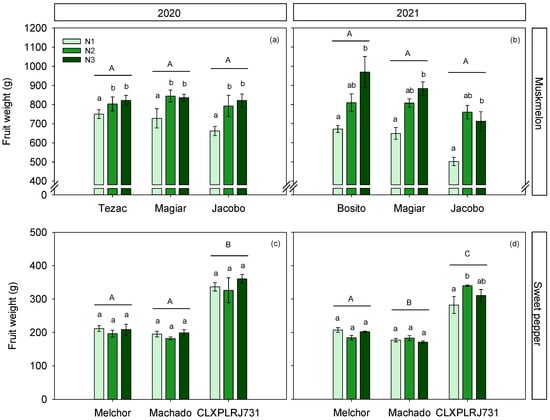 Fruit weight for three cultivars and three N treatments, for muskmelon (a,b) and sweet pepper (c,d) crops, conducted in 2020 and 2021 years. Different lowercase letters show significant differences between N treatments within each cultivar; different uppercase letters show significant differences between cultivars. Values are means ± SE.