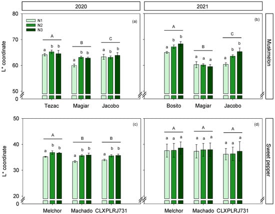 Fruit L* (lightness) for three cultivars and three N treatments, for muskmelon (a,b) and sweet pepper (c,d) crops, conducted in 2020 and 2021 years. Fruit measurements are internal for muskmelon and external for sweet pepper. Different lowercase letters show significant differences between N treatments within each cultivar; different uppercase letters show significant differences between cultivars. Values are means ± SE.