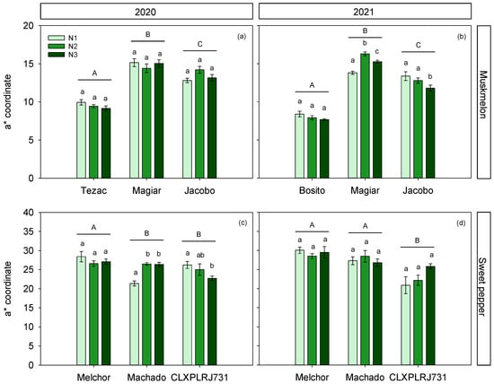 Fruit a* (red–green axis) for three cultivars and three N treatments, for muskmelon (a,b) and sweet pepper (c,d) crops, conducted in 2020 and 2021 years. Fruit measurements are internal for muskmelon and external for sweet pepper. Different lowercase letters show significant differences between N treatments within each cultivar; different uppercase letters show significant differences between cultivars. Values are means ± SE.