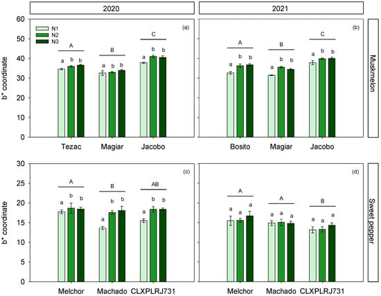 Fruit b* (blue–yellow axis) for three cultivars and three N treatments, for muskmelon (a,b) and sweet pepper (c,d) crops, conducted in 2020 and 2021 years. Fruit measurements are internal for muskmelon and external for sweet pepper. Different lowercase letters show significant differences between N treatments within each cultivar; different uppercase letters show significant differences between cultivars. Values are means ± SE.