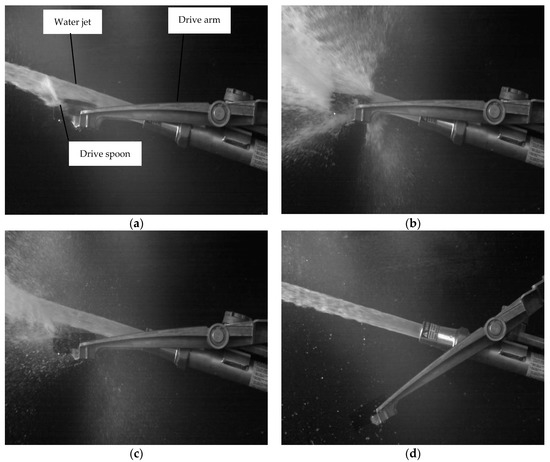 Figure 4 presents the movement process of the drive arm when the Big Gun® sprinkler was operating normally. The non-free movement means that the drive spoon moved in the water jet and as shown in Figure 4a–c. During this stage, the drive spoon was impacted by the water jet. Contrarily, the water jet was dispersed by the drive spoon and the time of non-free movement was the duration. When the drive spoon escaped completely from the water jet, the drive arm was subjected only to the influences of gravity, the frictional resistance on the rotation shaft, and the air resistance. This stage was named as the free movement process and is shown in Figure 4d.