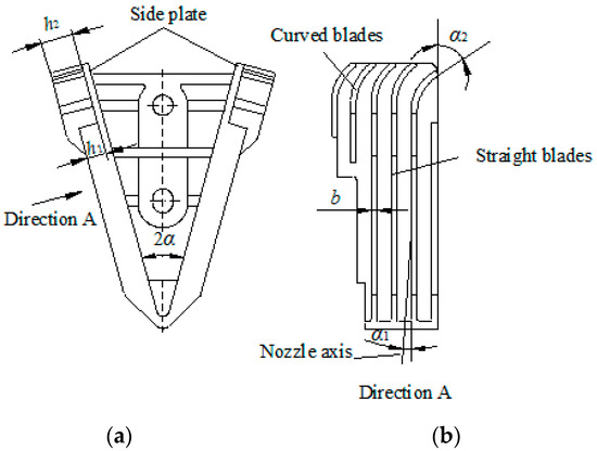 Structural diagram of the drive spoon: (a) top view of drive spoon; (b) view from direction A. α is the angle between the straight blades and the centreline of water jet (°); α1 is the angle of straight blades into the water jet (°); α2 is the outlet angle of the water jet on the curved blades (°); h1 is the width of the straight blade (mm); h2 is the width of the curved blade (mm); b is the blade thickness (mm).