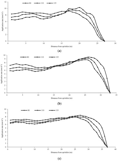 As mentioned above, the most convenient method to change the frequency and duration of the drive spoon dispersed–water jet is by adjusting the counterweight-installed position. Figure 7 presents a comparison of water distribution patterns between different counterweight-installed positions with the working pressures of 0.30, 0.35, and 0.40 MPa. As can be seen from this figure, the application rates near the sprinkler were supplemented more sufficiently when the counterweight was 80 mm for different working pressures. The water distribution at the near range (1–15 m) became increasingly uniform as the distance between counterweight and rotation axis decreased. On the one hand, this confirmed that the water jet break-up mechanism was an important device for changing the water distribution pattern [16,26]. On the other hand, the results indicated that frequency had a greater influence on the water distribution pattern than did duration. The application rates within 1–13 m improved and increased about 30% as the distance decreased from 135 mm to 80 mm; this was consistent with the above analysis. The frequency of the drive spoon–dispersed water jet was reduced when the counterweight was far away from the rotation axis, which reduced the volume of the dispersed water in short ranges. At the same time, the maximum application rates decreased from 10.3 to 9.2 mm h−1, 9.5 to 8.8 mm h−1, and 8.4 to 7.9 mm h−1 with working pressures of 0.30, 0.35, and 0.40 MPa, respectively. This was effective for reducing the risk of disruption of crops and surface runoff [38].