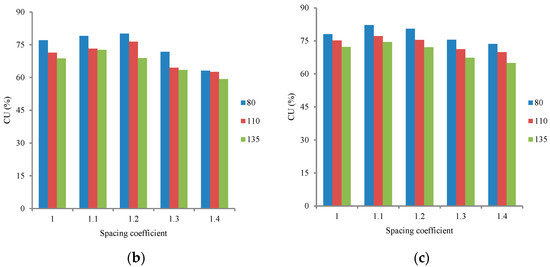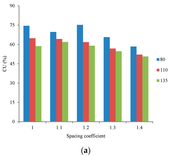 Figure 8 presents the relationships between the CU values and spacing coefficients for various counterweight-installed positions with the working pressures of 0.3, 0.35, and 0.40 MPa. Water distribution uniformity generally increased with increased working pressure [11,12,40]. For all the spacing coefficients, higher CU values were obtained at higher working pressures and lower CU values were obtained at lower working pressures. The CU values decreased as the distance between the counterweight and the rotation axis increased, which indicated that it was a useful method to improve water distribution uniformity by increasing the frequency of the drive spoon–dispersed water jet. As can be seen from Figure 8a, the maximum CU value was obtained with a spacing coefficient of 1.2 under a working pressure of 0.30 MPa, and it increased from 58.96% to 75.1% as the distance decreased from 135 mm to 80 mm. As can be seen from Figure 8b, the maximum CU value was obtained with a spacing coefficient of 1.2 under a working pressure of 0.35 MPa, and it increased from 68.85% to 80.1% as the distance decreased from 135 mm to 80 mm. As can be seen from Figure 8c, the maximum CU value was obtained with a spacing coefficient of 1.2 under a working pressure of 0.40 MPa, and it increased from 72.46% to 82.17% as the distance decreased from 135 mm to 80 mm. A comparative analysis of the increasing ranges of CU value with different spacing coefficients for 0.30 and 0.40 MPa showed that increasing the frequency under low working pressure was more effective than under high working pressure. In general, reducing the working pressure can result in decreasing the water distribution uniformity [25,26]. Hence, the results provided an effective method to maintain satisfying water distribution uniformity while decreasing energy consumption by reducing working pressure. El-Wahed et al. [41] investigated the impact of sprinkler irrigation uniformity on crop yield and water use efficiency, and indicated that high uniformity was consistent with high yield and high water-use efficiency. M. El-Marsafawy et al. [42] estimated maximum crop water productivity trends under conditions in the Northern Nile Delta over three decades, and indicated that the better the distribution of water in the field, the higher the crop yield. Therefore, the results of this study are beneficial to improve crop yield and water-use efficiency in practical applications.
