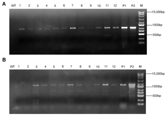 PCR-based amplification of genomic DNA for initial screening of the putative T0 transgenic alfalfa. All twelve transgenic lines generated an amplicon of the Hyg gene (1024 bp) consistent with the positive control (Figure 2A); meanwhile, the transgenic lines 3, 4, 5, 6, 7, 8, 9, 10, 11, and 12 generated an amplicon of 1695 bp specific for the ScABI3 gene (Figure 2B). However, no Hyg and ScABI3 bands appeared in the WT (Figure 2). These results confirmed that 10/12 lines were positive, resulting in a positive transformation rate of 83.3%.