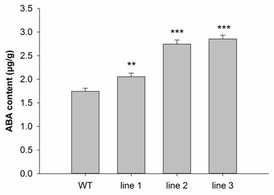 ABA content of WT and transgenic alfalfa. Data were expressed as mean ± SE (n ≥ 6). WT: wild-type alfalfa; line 1, 2, 3: transgenic alfalfa. ** and *** indicates a statistically significant difference at p < 0.01 and p < 0.001, respectively.