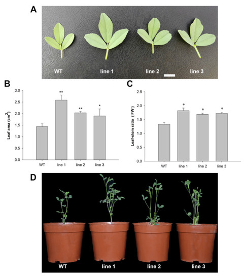 The area of the third leaf from the top of the six-week-old transgenic and WT alfalfa plants was measured with ImageJ software. The area was measured for at least 30 leaves per line, and each measurement was repeated three times.