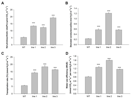 We further analyzed the gas exchange parameters to know the photosynthetic efficiency of ScABI3-overexpressing lines. The average Pn of transgenic alfalfa was 182.10% higher than the WT (p < 0.001). Among the transgenics, line 3 had the highest Pn (19.25 μmol CO2·m−2·s−1), while line 2 had the lowest (12.36 μmol CO2·m−2·s−1); the Pn of WT was 5.32 μmol CO2·m−2·s−1 (Figure 6A). Similar trends were found in Gs, Tr, and WUE. The average Gs of transgenic alfalfa was 0.79 mol H2O·m−2·s−1, and that of WT was 0.23 mol H2O·m−2·s−1 (Figure 6B). The transgenic lines had a 243.09% higher stomatal conductance than the WT (p < 0.001). Meanwhile, the average Tr of transgenic alfalfa was 16.34 mmol H2O·m−2·s−1, and that of the WT was 5.56 mmol H2O·m−2·s−1 (Figure 6C); Tr of the transgenic alfalfa was 194.01% higher than the WT (p < 0.001). The average WUE of transgenic alfalfa (1.35 mmol CO2·m−2·s−1 per mol H2O m−2·s−1) was 67.04% higher than the WT (0.81 mmol CO2·m−2·s−1 per mol H2O m−2·s−1) (p < 0.001) (Figure 6D). These observations suggested that the overexpression of ScABI3 increased the photosynthetic efficiency and WUE of alfalfa.