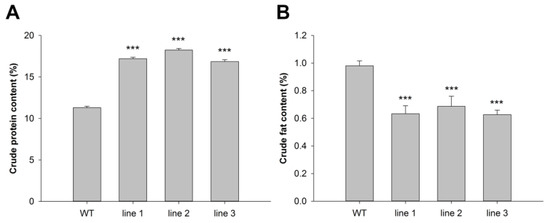 Crude protein and crude fat contents of WT and transgenic alfalfa. (A) The crude protein content of WT and transgenic alfalfa. (B) The crude fat content of WT and transgenic alfalfa. Data were expressed as mean ± SE (n ≥ 6). WT: wild-type alfalfa; line 1, 2, 3: transgenic alfalfa. *** indicates a statistically significant difference at p < 0.001.