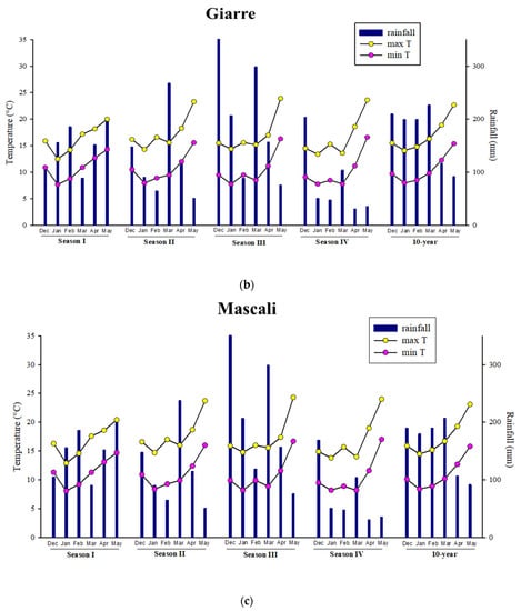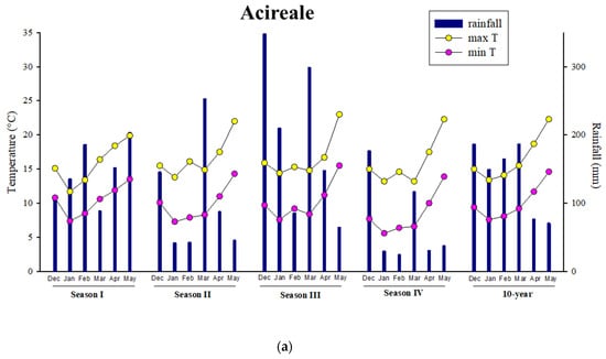 Monthly rainfall, average minima and maxima monthly air temperatures, and 10-year (2013–2022) climatic trend in Acireale (a), Giarre (b), and Mascali (c) throughout Season I (2018–2019), Season II (2019–2020), Season III (2020–2021), and Season IV (2021–2022).