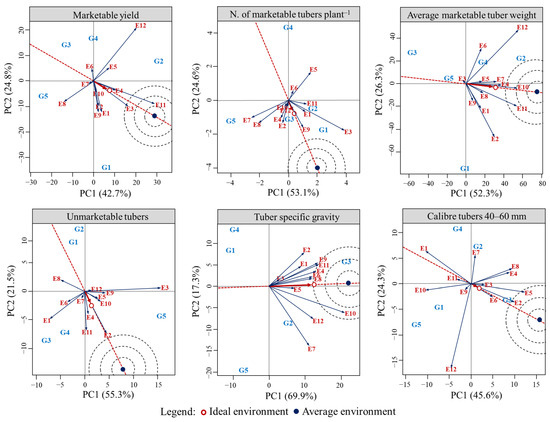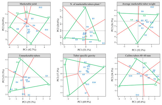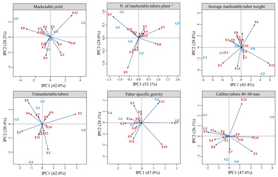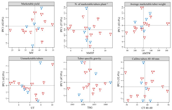 AMMI and GGE analyses divided the GEI sum of squares into IPCs (Table S2) and PCs (Table S3) to unfold the variance components. Both multivariate models were significant for potato yield and yield-related traits, except for CT < 40 mm and CT > 60 mm (Table 3), which therefore were not further analyzed. About AMMI, the cumulative contribution of IPC1 and IPC2 captured 70.2% of the GEI sum of squares for MY, 82.4% for UT, 80.4% for NMTP, 72.2% for AMTW, 75.1% for TSG, and 73.7% for CT 40–60 mm. Similarly, the first two PCs explained 67.5% of the GEI sum of squares for MY, 76.8% for UT, 77.7% for NMTP, 78.6% for AMTW, 87.2% for TSG, and 69.9% for CT 40–60 mm in the GGE model. These percentages demonstrated the validity of the AMMI and GGE models in representing the GEI in the present study. In fact, Thangavel et al. [44] asserted that an IPCA1 + IPCA2 cumulative variation > 66% is a reliable interpretation of the GEI for the AMMI models, while according to Yang et al. [45] a PC1 + PC2 variation > 60% is desirable for GGE. GEI interactions were graphically represented through five biplot patterns.