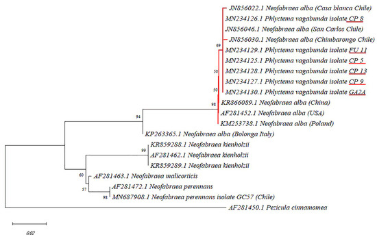 Phylogenic tree showing the relationships between Neofabraea spp. isolates published in GenBank and the isolates obtained in this study (CP5, CP8, CP9, CP13, FU11, and GA2A), inferred by the neighbor-joining method based on the partial sequencing of the β-tubulin gene. Pezicula cinnamomea was used as an outgroup.