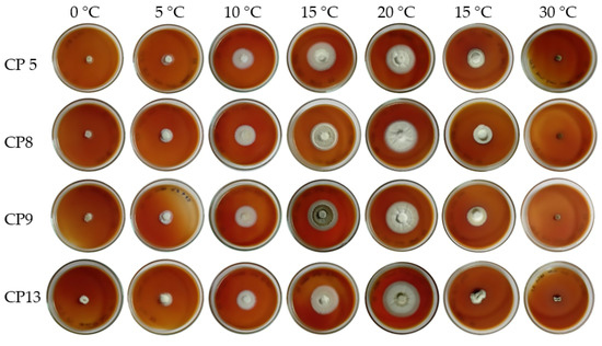 Temperatures of 15 and 20 °C induced the highest mycelial growth for the four Chilean P. vagabunda isolates (CP5, CP8, CP9, and CP13) tested in this assay (Table 1 and Figure 2), where the isolate CP13 outstood with the highest mycelial growth at 20 °C. The mycelial growth of the isolates was significantly lower (nested ANOVA, F = 6.11, p ≤ 0.0001, df = 21.56) at temperatures higher than 20 °C and lower than 15 °C, and at 30 °C no mycelial growth was detected. On the other hand, when Chilean isolates were tested at the same temperature that apple fruits are normally stored (0 °C) and at 5 °C, the fungal mycelial growth was lower, but it never stopped growing (Table 1). The four Chilean isolates showed conidial production only at 0 and 5 °C; no conidia were observed at the other tested temperatures (Table 1).