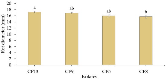 Disease severity (rot diameter) of Chilean CP13, CP9, CP5, and CP8 isolates of Phlyctema vagabunda in ‘Cripps Pink’ apples incubated at 20 °C for 20 days. Letters on bar indicate statistical differences between isolates after Tukey test (p < 0.05).