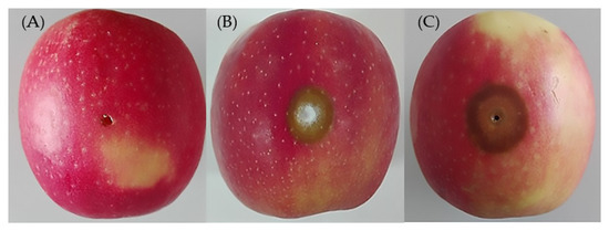 Postharvest diseases represent an important limitation to preserving high-quality commercial fruit for a prolonged storage period [7]. Fruit infection occurs in the field and is favored by long periods of rainfall and temperatures near 20 °C [3], but symptoms show up after 3 to 5 months of cold storage (0 °C), with individual or numerous lesions observed in a single fruit [8]. Disease symptoms are characterized by a circular, slightly sunken lesion with concentric rings that can vary in color from light brown to dark brown, originating from a lenticel in the fruit epidermis [9]. According to the literature, the incidence of bull’s-eye rot may vary from 10 to 60% in late-harvest cultivars such as ‘Cripps Pink’, where they are the most affected varieties, with disease incidences depending on the season and locality [4]. In organic production, incidences in these cultivars can be as high as 80–90%. Furthermore, economic losses can be further increased if the pathogen presents a quarantine condition for export markets [10], as is the case in China [11].