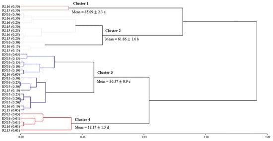 Phenogram of the cluster analysis of the inhibition of the mycelial growth of Phlyctema vagabunda (CP13 isolate) by the four propolis extracts (RÑ15, RÑ16, RL15, and RL16) at different concentrations (0.01, 0.05, 0.1, 0.2, 0.25, 0.3, and 0.5%). Average—average linkage and Euclidean distance. Means with the different letter is showing a significant difference (p < 0.05) between clusters.