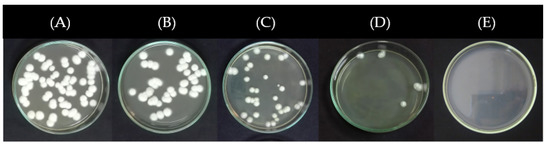 Inhibition of conidia germination of the P. vagabunda isolate was determined using the methodology described above at the following propolis concentrations: 0.00, 0.005, 0.01, 0.05, and 0.1%. In these cases, the propolis (LR16) that showed the greater inhibition of mycelial growth in previous experiments was tested against isolate CP13. Thus, 150 μL of a conidial suspension of the pathogen (1 × 104 conidia mL−1) was spread in Petri dishes with apple juice agar containing different propolis concentrations and incubated at 20 °C for 4 days. The control corresponded to ethanol (50%). Three replicates (plates) were performed per concentration, and a control treatment without propolis was included. The percentage of inhibition of conidial germination was determined with the formula: