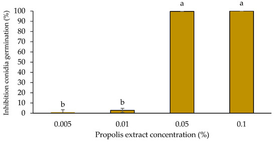 Considering the previous results, the effect of propolis extract LR16 at 0.005, 0.01, 0.05, and 0.1% on the inhibition of conidial germination of CP13 isolate was evaluated. Significant differences (one-way ANOVA F = 110.4, p < 0.001, df = 3, 8) were detected between propolis extract concentrations. Conidia germination inhibition was lower than 5% when exposed to the lowest propolis extract concentrations (0.005 and 0.01%). On the other hand, when the propolis extract concentration increased (0.05 and 0.1%), there was a 100% inhibition of CP13 isolate conidia germination (Figure 6 and Figure 7).