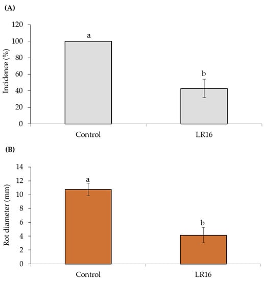 Incidence (A) and severity (B) of Phlyctema vagabunda (CP13 isolate) in apples treated with 0.5% propolis LR16. Letters indicate statistical differences (t-test, p < 0.05) between treatments after 20 days of incubation at 20 °C.