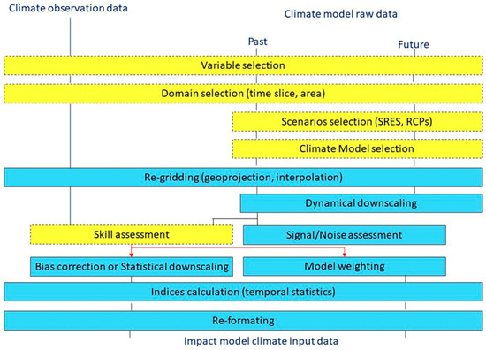 Steps required to assess CC impacts (adapted IS-ENES, 2019). Legend. Yellow boxes—crucial steps; blue boxes—optional steps.