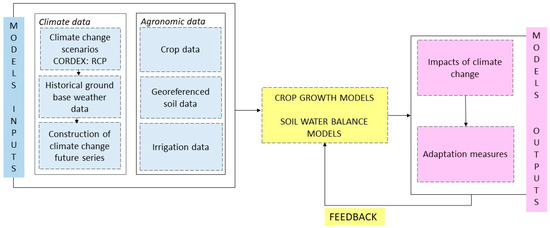 Figure 4. Schematic representation of the most common conceptual approaches applied to assess the impacts of climate change on Agriculture using crop growth and SWB models. - The temporal analogy consists of referring to an earlier period as an image of a future CCS to respond to climatic variability. For example, studying the behavior of a crop in a particularly hot year as an indicator of the impact of future CC. The spatial analogy involves conducting research in one region and identifying parallels to how another region might be affected by climate change [97]. However, the characteristics of the chosen region may not be the same as those of the area under study, namely referring to the latitude (solar radiation);