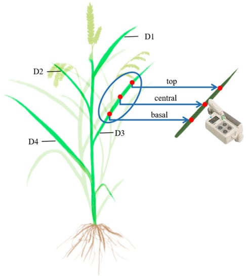 A portable chlorophyll meter (SPAD-502 Plus, Konica Minolta, Tokyo, Japan) was used to measure the relative chlorophyll content of the leaves in situ (Figure 2). During the measurement, three rice plants with uniform growth were selected and labeled. The top, central, and basal positions of the first leaf (D1), second leaf (D2), third leaf (D3), and fourth leaf (D4) were measured. Each position was measured six times, and the average value was taken as the relative chlorophyll content (SPAD) value for the position. During the measurement, positions where the leaf veins were concentrated were avoided and direct sunlight was properly blocked to ensure the accuracy of the measurement [24].