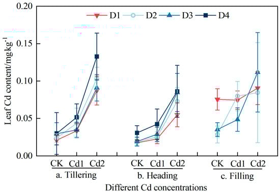 Effect of different Cd stress concentrations on Cd content of rice canopy leaves during different growth stages ((a) Tillering; (b) Heading; (c) Filling). D1-D4 represent the leaf position from top to bottom of the plant.