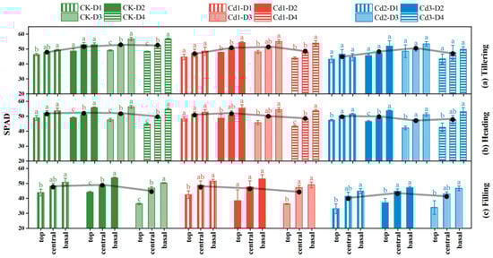 Rice canopy leaves of the relative chlorophyll content during different growth stages ((a) Tillering; (b) Heading; (c) Filling). The black dot represents the average value of SPAD at the top, central and basal. D1–D4 represent the leaf position from top to bottom of the plant, lowercase letters indicate significant differences.