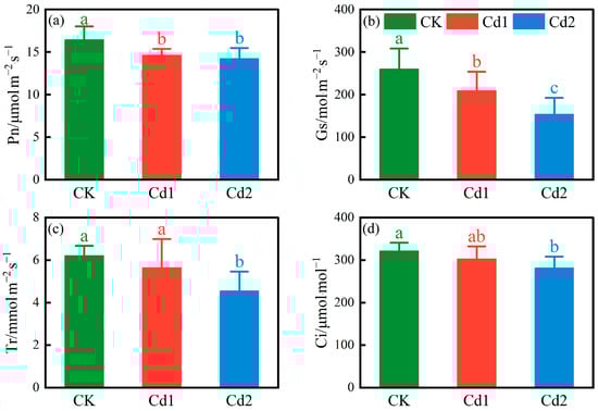 Changes in photosynthetic parameters of rice leaves under different Cd stress concentrations((a) Net photosynthetic rate (Pn); (b) Stomatal conductance (Gs); (c) Transpiration rate (Tr); (d) intercellular CO2 concentration (Ci)), lowercase letters indicate significant differences.