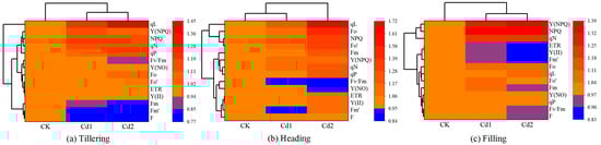 Cluster heat maps of different Cd stress concentrations and Chlorophyll fluorescence parameters during different growth stages ((a) Tillering; (b) Heading; (c) Filling). Taking the CK treatment as the control (CK treatment equals 1, denoted by orange) and parameters of another treatment of the stage are expressed by a fraction relative to the corresponding value of the CK treatment. The redder the color is, the bigger it is relative to CK, and the bluer the color is, the smaller it is relative to CK.