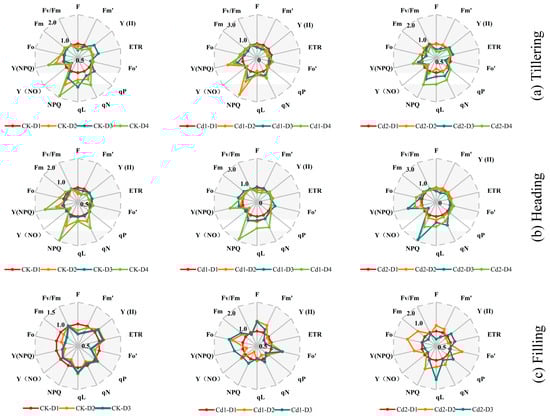 Radar plots of the CK, Cd1, and Cd2 treatment with a series of important parameters derived from the Chlorophyll fluorescence during different growth stages ((a) Tillering; (b) Heading; (c) Filling). These parameters for each leaf are the average of all samples with the CK, Cd1, and Cd2 treatment. Taking each leaf at the D1 position as the control (each parameter equals 1, denoted by a red circle) and the parameters of another leaf of the stage are expressed by a fraction relative to the corresponding value of the D1 layer leaf, the number of the outermost circle represents the maximum value of its scale mark. Lines of different colors represent values from D1 to D4.