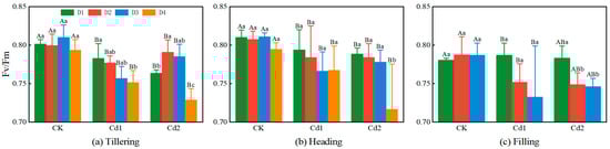 Effect of different cadmium stress concentrations on Fv/Fm of rice canopy leaves at different leaf positions during different growth stages ((a) Tillering; (b) Heading; (c) Filling). Uppercase letters indicate significant differences between CK, Cd1, and Cd2, and lowercase letters indicate significant differences between D1, D2, D3, and D4.