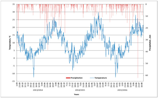 Daily mean air temperature and precipitation during the study, Experimental Station Smolice.