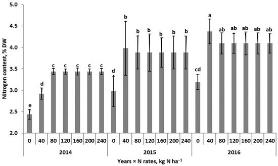 Effect of increasing nitrogen rates on the content of nitrogen in winter wheat at the beginning of the stem elongation phase in subsequent years of study. Similar letters means a lack of significant differences using Tukey’s test. The vertical bar in the column refers to the standard deviation value.