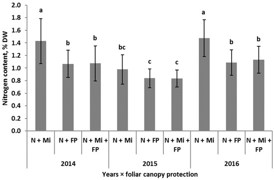 The content of nitrogen in winter wheat leaves at maturity in response to the method of foliar canopy protection in subsequent years of study. Similar letters means a lack of significant differences using Tukey’s test. Legend: N + Mi—nitrogen plus foliar applied micronutrients; N + FP—nitrogen + foliar applied fungicides; N + Mi + FP—nitrogen plus foliar applied micronutrients and fungicides. The vertical bar in the column refers to the standard deviation value.