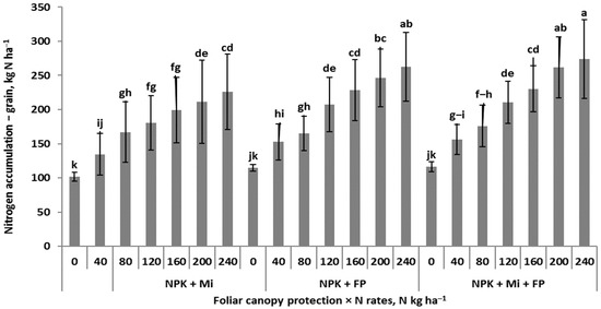 Response of SPAD indices to interaction of winter wheat canopy foliar protection and nitrogen rates. Similar letters means a lack of significant differences using Tukey’s test. The vertical bar in the column refers to the standard deviation value. Legend: N + Mi—nitrogen plus foliar applied micronutrients; N + FP—nitrogen + foliar applied fungicides; N + Mi + FP—nitrogen plus foliar applied micronutrients and fungicides. The vertical bar in the column refers to the standard deviation value.