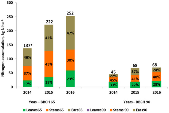 Total nitrogen accumulation in respective stages, TN, kg N ha−1: