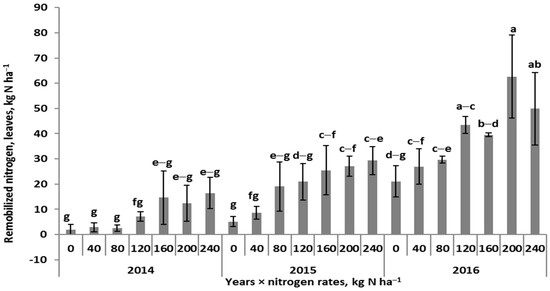 Effect of nitrogen rates on the content of nitrogen in winter wheat leaves at maturity. Similar letters means a lack of significant differences using Tukey’s test. The vertical bar in the column refers to the standard deviation value.