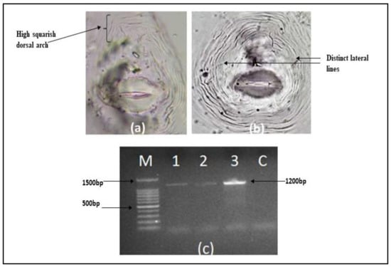 Perineal pattern of adult root-knot nematode females: (a) Meloidogyne incognita (showing high squarish dorsal arch with no lateral lines); (b) Meloidogyne javanica (perineal pattern with distinct lateral lines); (c) agarose gel (1%), showing amplification of 1200 bp that corresponds to Meloidogyne incognita sp. of root-knot nematode, using the SCAR Finc/Rinc primer from all of the three polyhouses; 1 = location-I; 2 = location-II; 3 = location-III; C—negative control; M—DNA marker (100 bp).