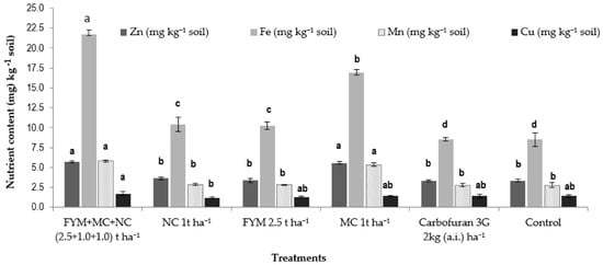As per the observations recorded in Table 6, an increase in organic carbon, phosphorus and potassium availability in the soil was observed in different treatments. Organic carbon was significantly higher in treatments with the application of MC 1 t ha−1 (1.02 g kg−1 soil) and the combined application of amendments (MC 1 t ha−1+ NC 1 t ha−1 + FYM 2.5 t ha−1) (0.96 g kg−1 soil), as compared to the untreated control (0.36 g kg−1 soil). The available phosphorus content in the soil was also at its maximum with the application of mustard cake (99.0 mg kg−1 soil) and the combined application of amendments (96.25 mg kg−1 soil). The potassium content was significantly higher in the combined application of amendments (397.5 mg kg−1 soil). The soil pH ranged from 7.5 to 7.75. In addition, the availability of micronutrients such as zinc, iron, manganese and copper was at its maximum in the soil treated with the combined application of amendments (Figure 2).